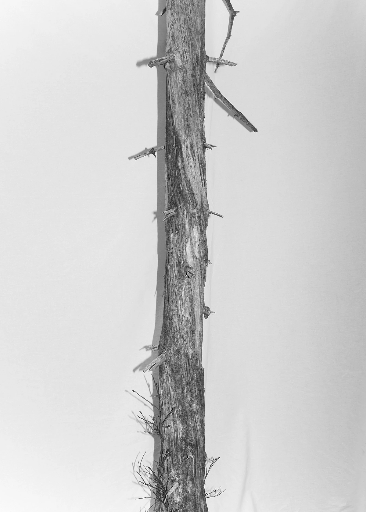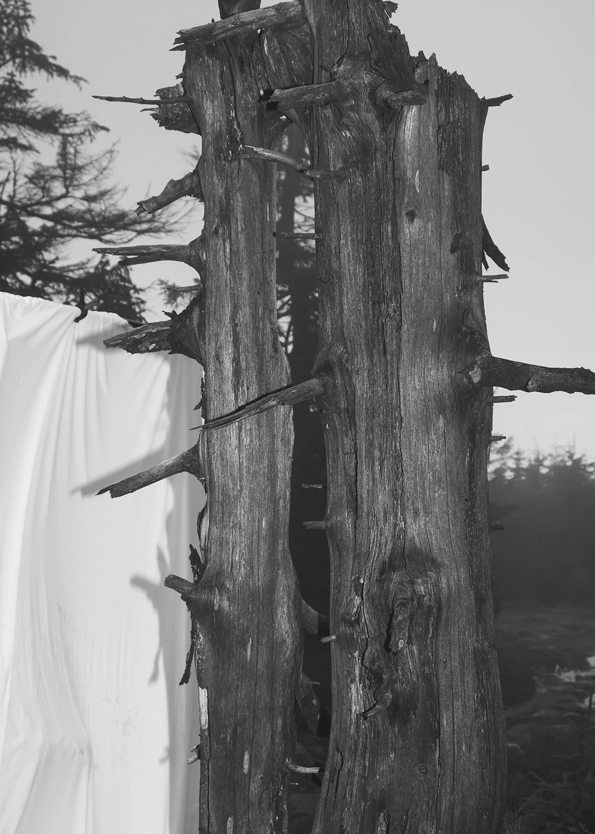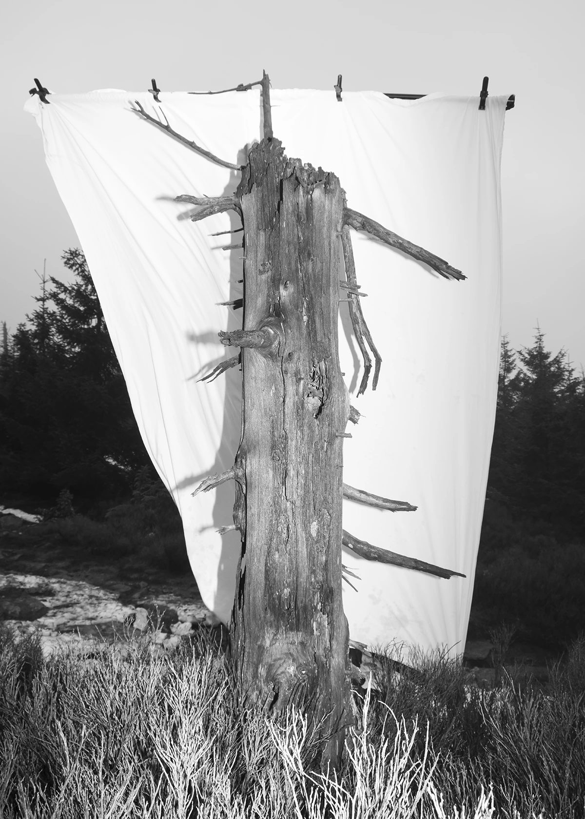 Martwe świerki wyabstrahowałam z ich naturalnego habitatu przy pomocy białego tła. Wysunęłam je na pierwszy plan, jednocześnie nie zawsze całkiem oddzielając od zielonego lasu za nimi. Chciałam sprawić, że staną się nieprzezroczyste, choć nieoderwane od miejsc, w których kiedyś żyły. Tło to lekki materiał, reagujący na każdy podmuch wiatru, otulający kikuty, czasem odbijający jedynie ich cień. Inne ujęcia to detale. Dzięki neutralności bieli mogłam całkowicie skupić się na bliznach i bruzdach w srebrnych pniach. Sfotografować je w sterylny sposób, jak dowody na miejscu zbrodni.