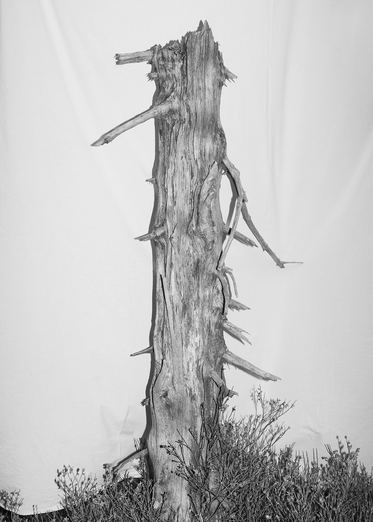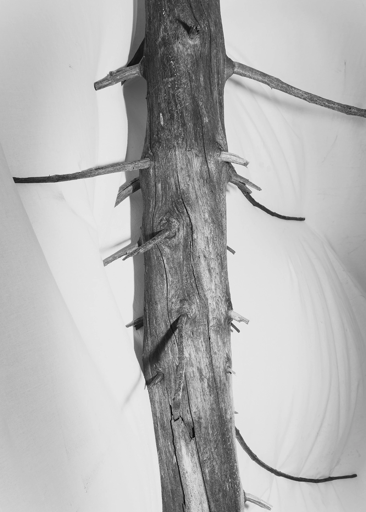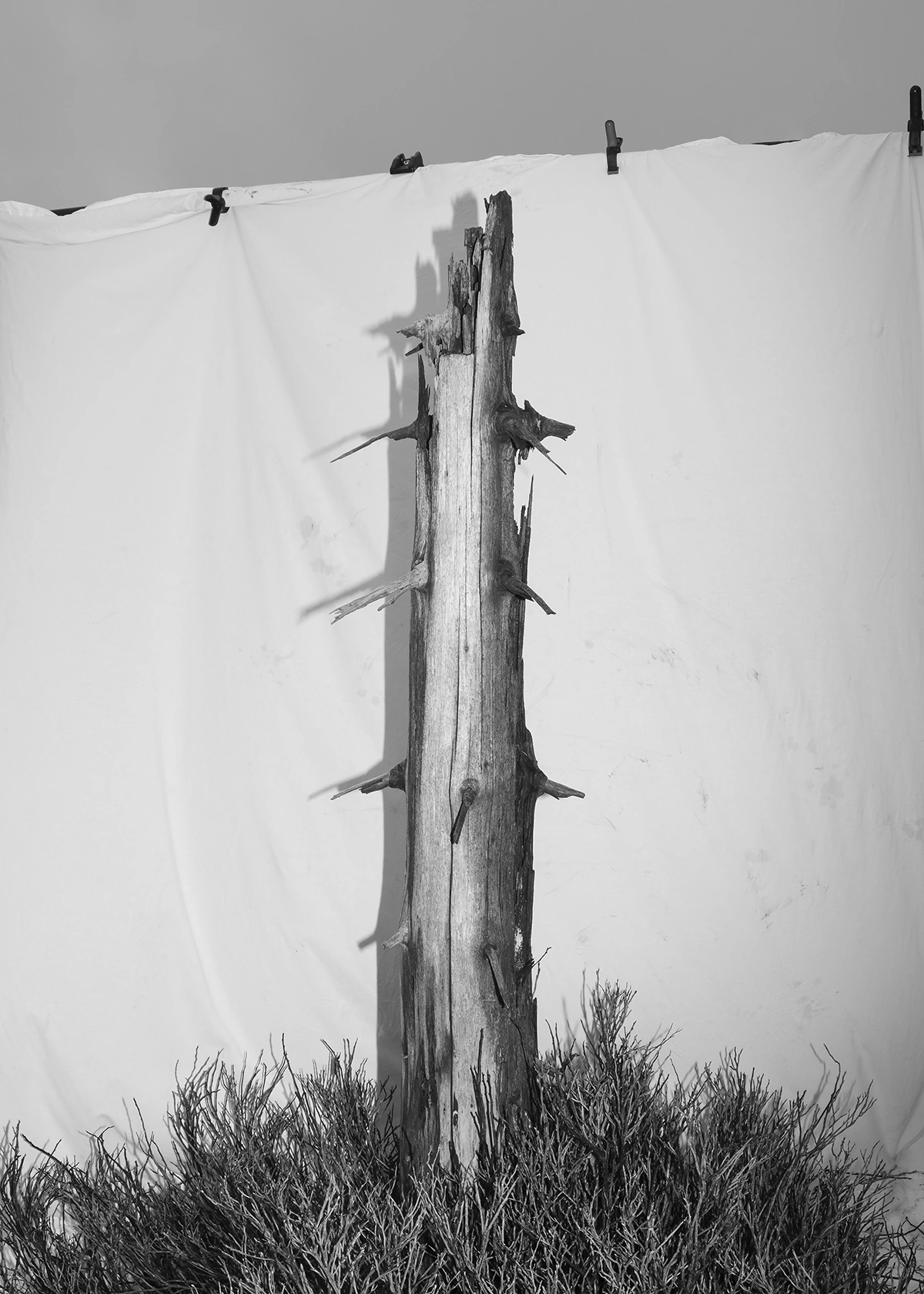 Martwe świerki wyabstrahowałam z ich naturalnego habitatu przy pomocy białego tła. Wysunęłam je na pierwszy plan, jednocześnie nie zawsze całkiem oddzielając od zielonego lasu za nimi. Chciałam sprawić, że staną się nieprzezroczyste, choć nieoderwane od miejsc, w których kiedyś żyły. Tło to lekki materiał, reagujący na każdy podmuch wiatru, otulający kikuty, czasem odbijający jedynie ich cień. Inne ujęcia to detale. Dzięki neutralności bieli mogłam całkowicie skupić się na bliznach i bruzdach w srebrnych pniach. Sfotografować je w sterylny sposób, jak dowody na miejscu zbrodni.