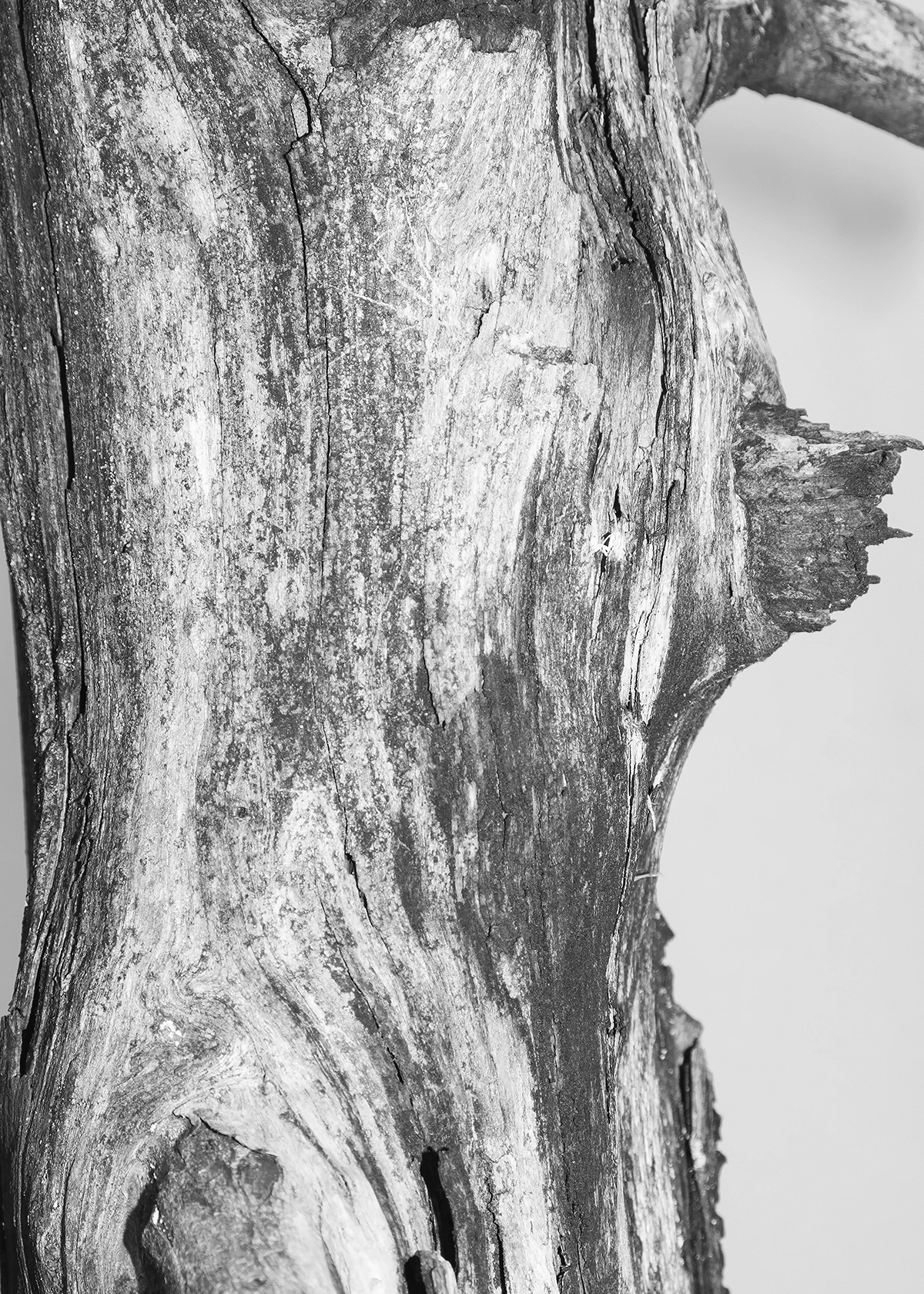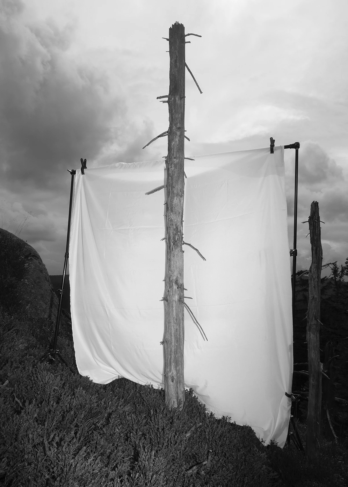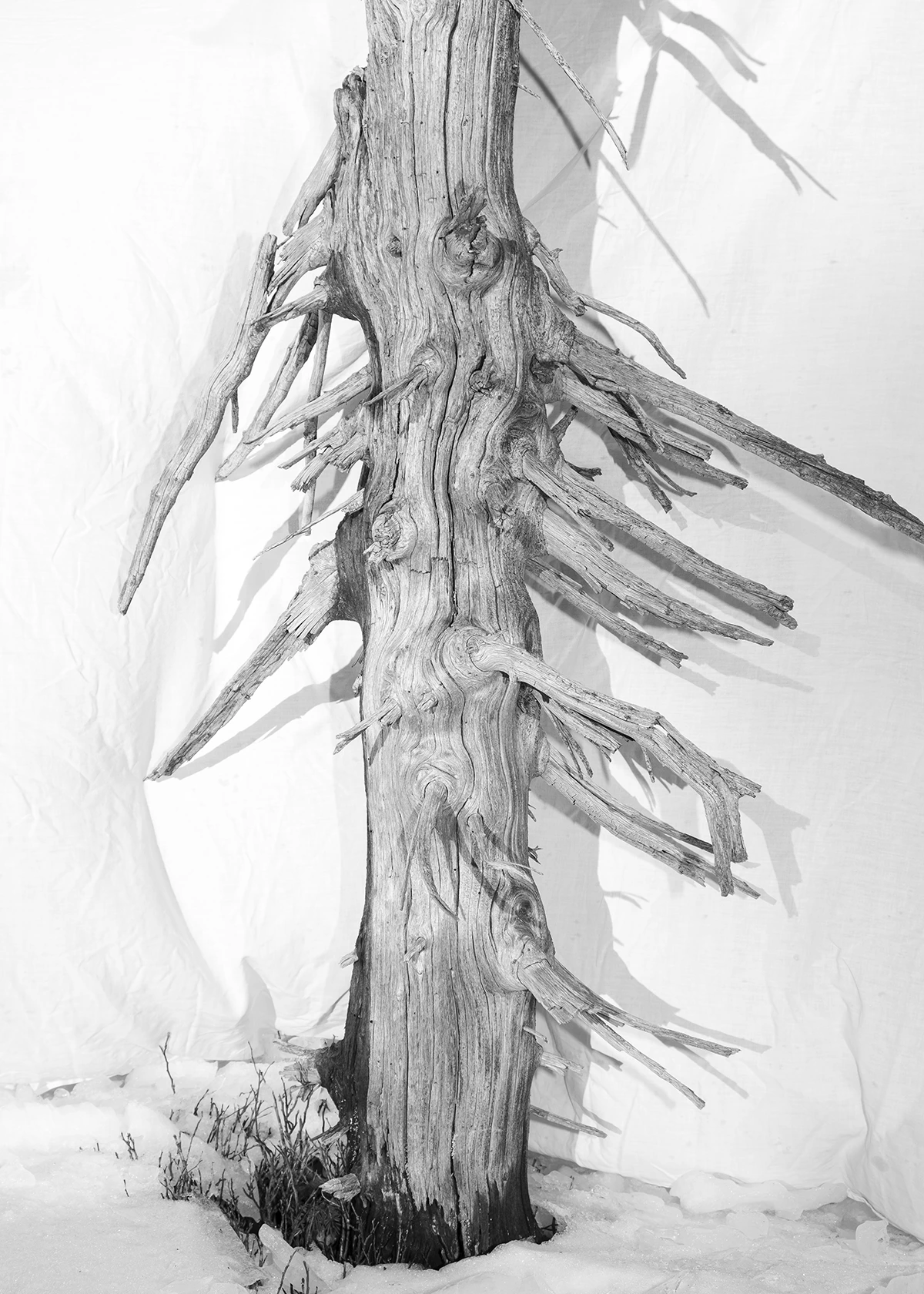 I abstracted dead spruce trees from their natural habitat using a white background. I brought them to the foreground, while not always completely separating them from the green forest behind them. I wanted to make them opaque, yet not detached from the places where they once lived. The background is a light material that reacts to every gust of wind, enveloping the stumps, sometimes reflecting only their shadows. Other shots are details. Thanks to the neutrality of white, I was able to focus entirely on the scars and furrows in the silver trunks. I photographed them in a sterile way, like evidence at a crime scene.
