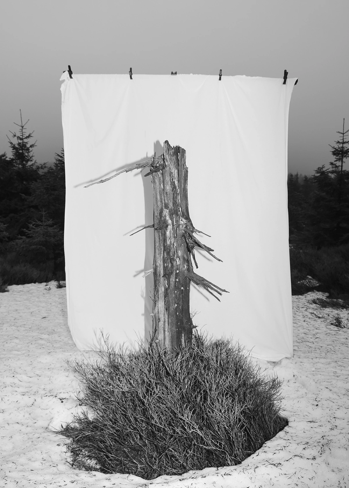 .. water, rain jacket, sandwiches, some sweets, and plenty of warm clothes. The weather in the Karkonosze Mountains can be extremely capricious, regardless of the season. I also throw in a few things that are not part of a standard mountain hiker’s equipment. I take a tripod, but it’s quite large and heavy, a camera, a white sheet, a few clothespins, and a flash. The weather is good, and there is not too much wind. I have at least a few kilometers of steep uphill walking ahead of me. The photos should turn out fine, hopefully there will be plenty of “stumps” along the trail I have chosen.